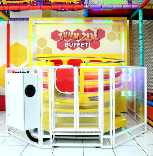 Um elevador projetado para crianças, com luzes coloridas . A torre sobe, desce, gira e realiza movimentos agradáveis que divertem as crianças.