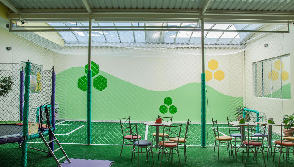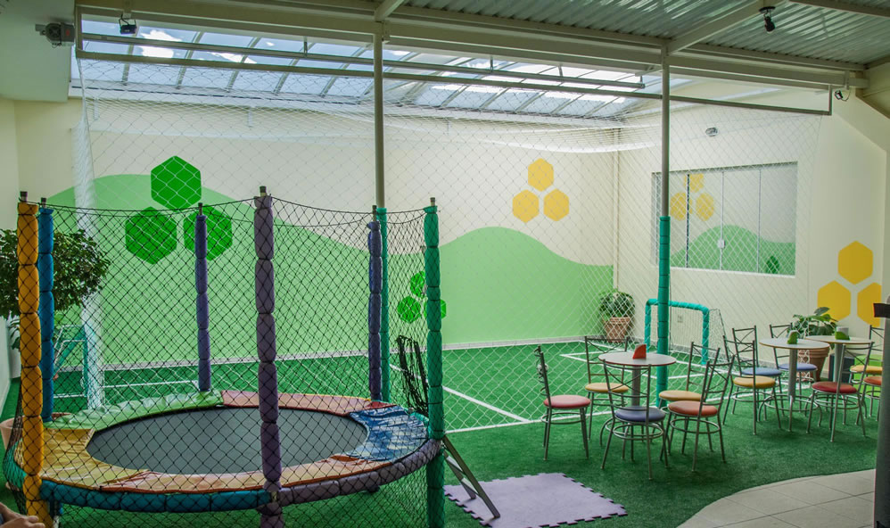 As crianças poderão desfrutar de um mini campo de grama sintética, que possui todas as características de um campo profissional. Porém contamos com uma inovação, o teto é retrátil, ou seja, dependendo do clima, é possível abrir ou fechar o compartimento do campo, para melhorar o conforto das crianças.
